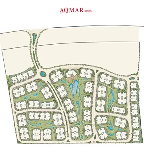 aqmar residence هو مشروع كبير يمتد على مساحة 41 فدان، وهي مساحة استغلها المصمم بعناية وذكاء لتقديم تجمع سكني نموذجي يضم مساحات خضراء وحدائق ومسطحات مائية على جزء كبير منها.