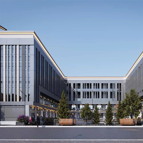 واجهات بانورامية بإطلالات فخمة: تعطي للمول مظهر جمالي فخم ومتميز كما توفر له إطلالات جذابة على المساحات الخضراء التي تحيط بالمول.