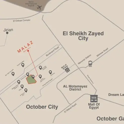 هناك باقة متنوعة من الأماكن التي تحيط بـ malaz october والتي جعلت موقعه استثنائي ومناسب للعيش والاستثمار ويوجد على مقربة من أبرز المراكز التجارية التي من بينها مول العرب وهايبر وان بالإضافة إلى كارفور مما يوفر تجربة التسوق المتكاملة على بعد دقائق قليلة.