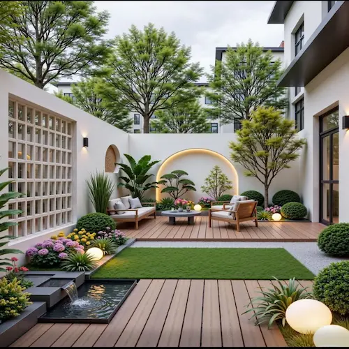 الطرق الداخلية مصممة بانسيابية تمنع التكدس، والمساحات الخضراء الواسعة تحيط بالمباني لتعمل كعازل طبيعي ضد الأصوات.